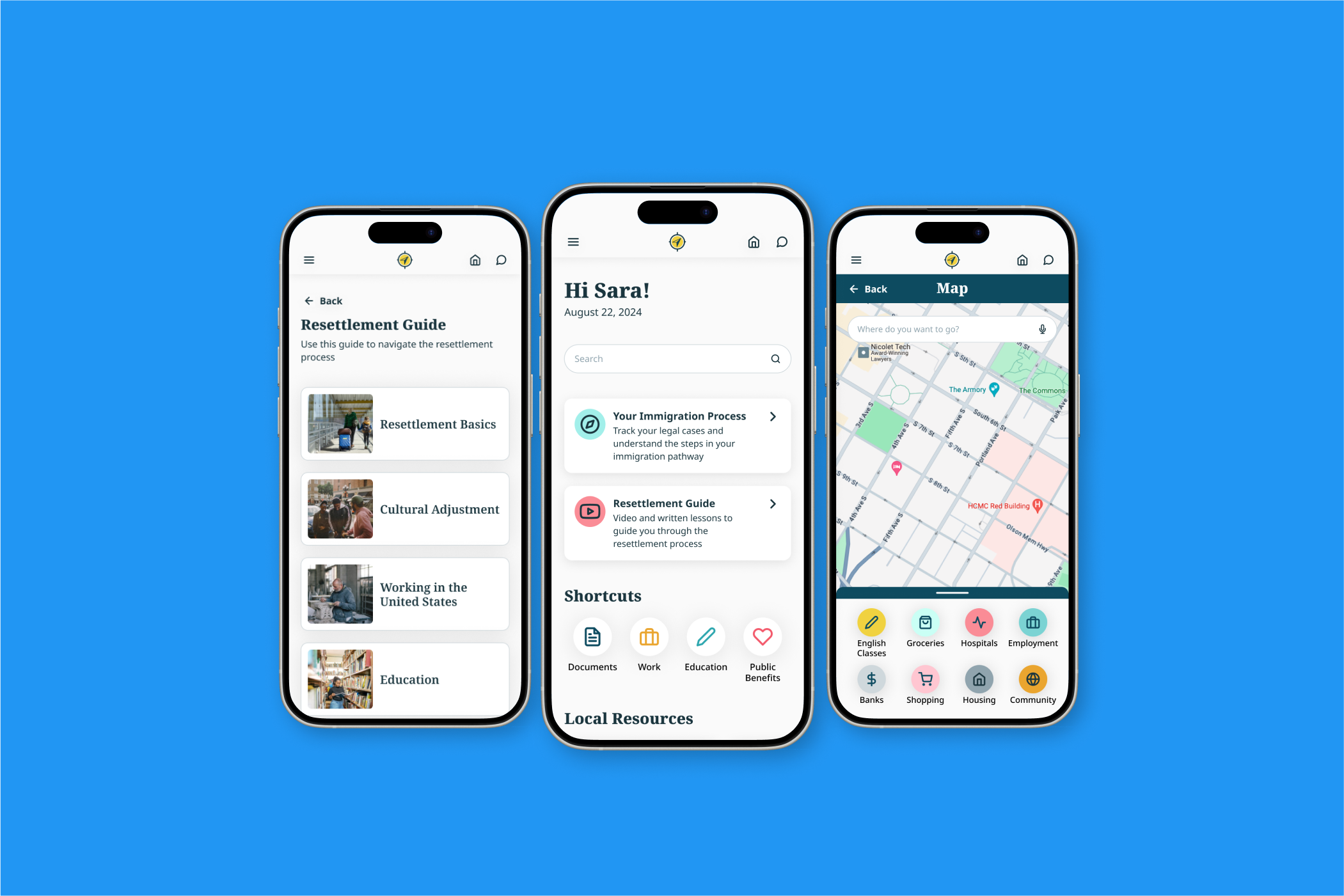 Designed an intuitive app to streamline the refugee resettlement process, integrating document management, local resource access, and language support to empower users to confidently navigate their resettlement journey.