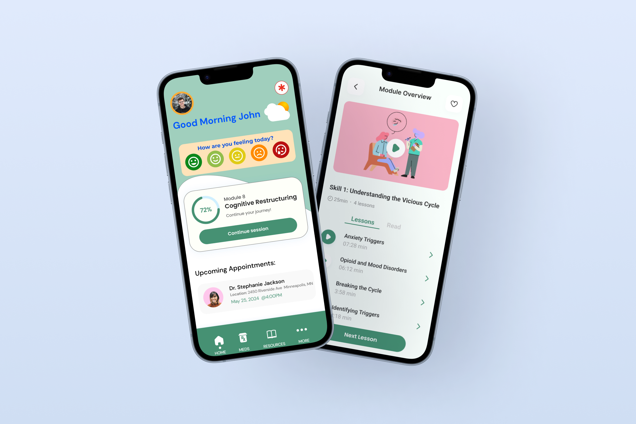 Designed a digital therapeutic app to support personalized recovery journeys, integrating user-centered UX and mHealth solutions for effective opioid recovery management.